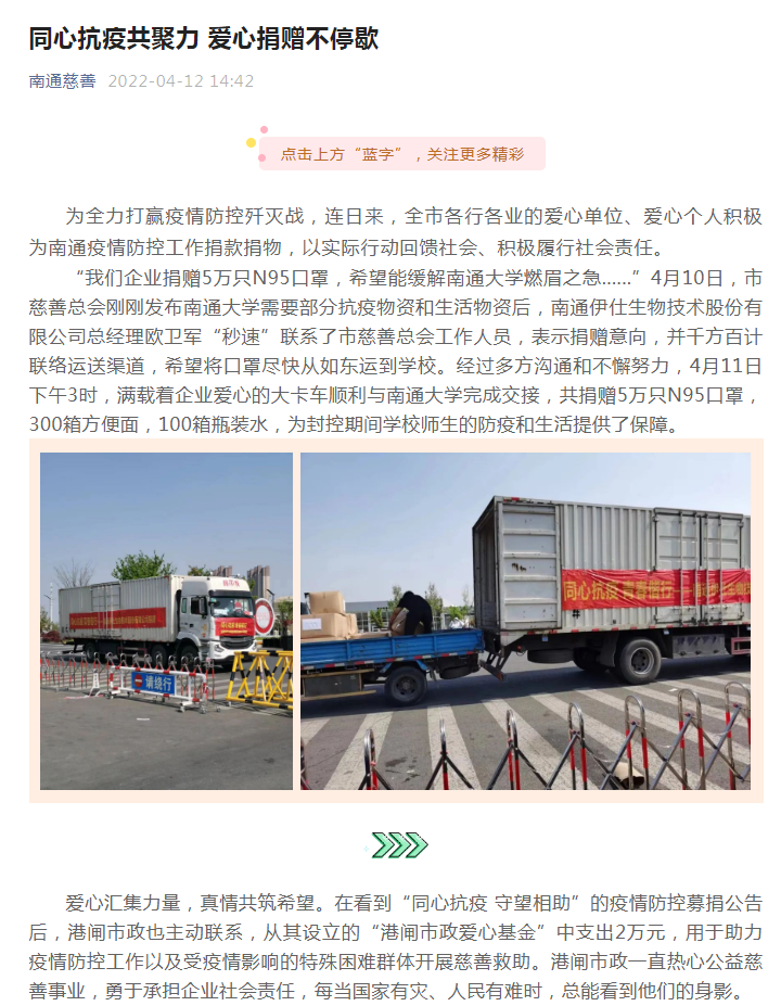 為全力打贏疫情防控殲滅戰(zhàn),在看到南通市慈善總會“同心抗疫,守望相助”的疫情防控募捐公告后,我公司從設(shè)立的“港閘市政愛心基金”中支出2萬元,用于助力疫情防控工作以及受疫情影響的特殊困難群體開展慈善救助。
